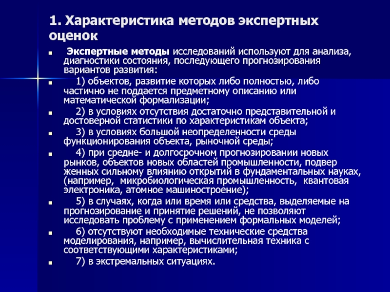 1. Характеристика методов экспертных оценок Экспертные методы исследований используют для анализа, диагностики состояния, последующего прогнозирования вариантов развития: