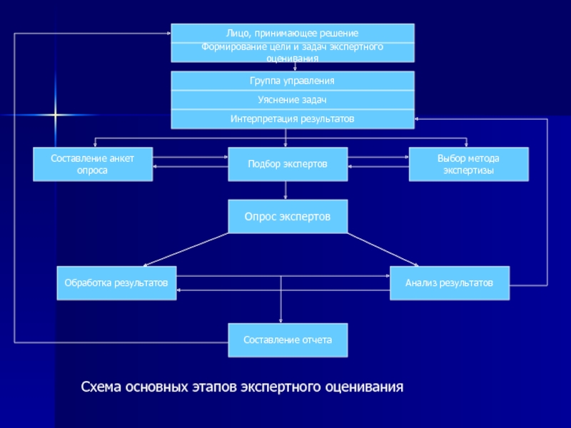 Лицо, принимающее решениеФормирование цели и задач экспертного оцениванияГруппа управленияУяснение задачИнтерпретация результатовСоставление анкет опросаВыбор метода экспертизыПодбор экспертовОпрос экспертовАнализ