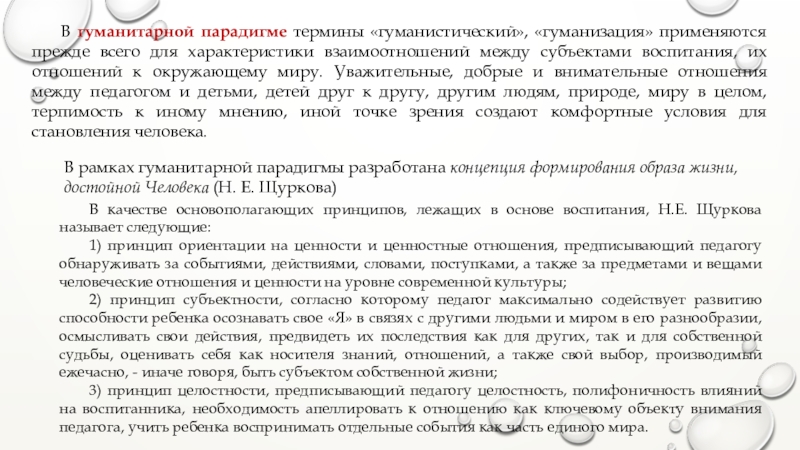 В качестве основополагающих принципов, лежащих в основе воспитания, Н.Е. Щуркова называет следующие: