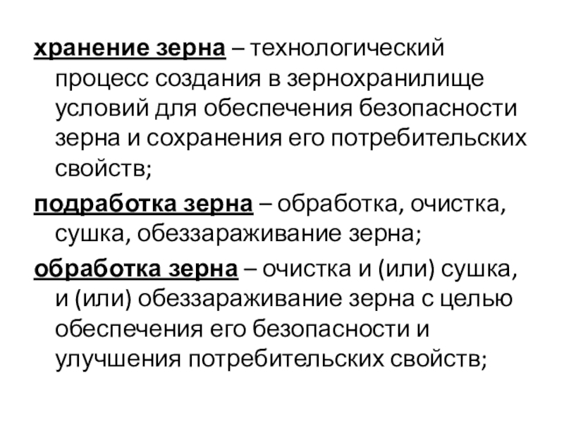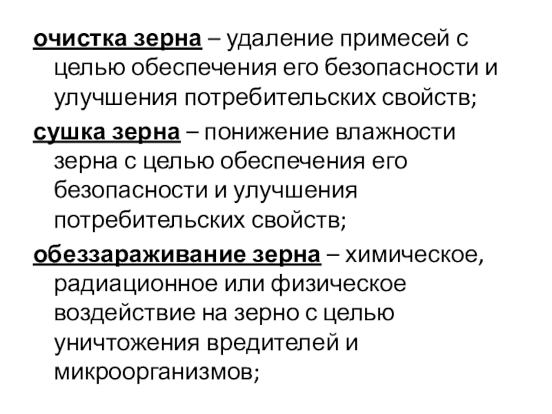 обработка зерна – очистка и (или) сушка, и (или) обеззараживание зерна с целью обеспечения его безопасности и улучшения потребительских свойств;
