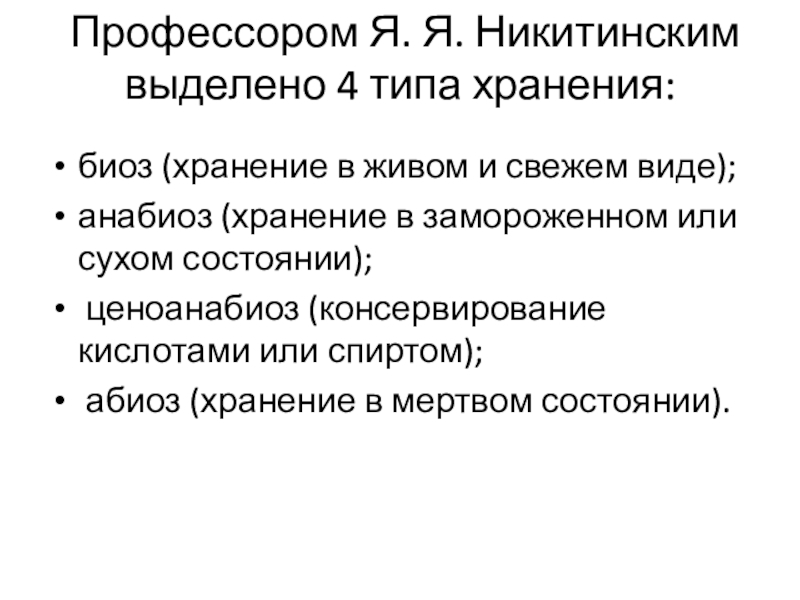 Слайд 13 Профессором Я. Я. Никитинским выделено 4 типа хранения: