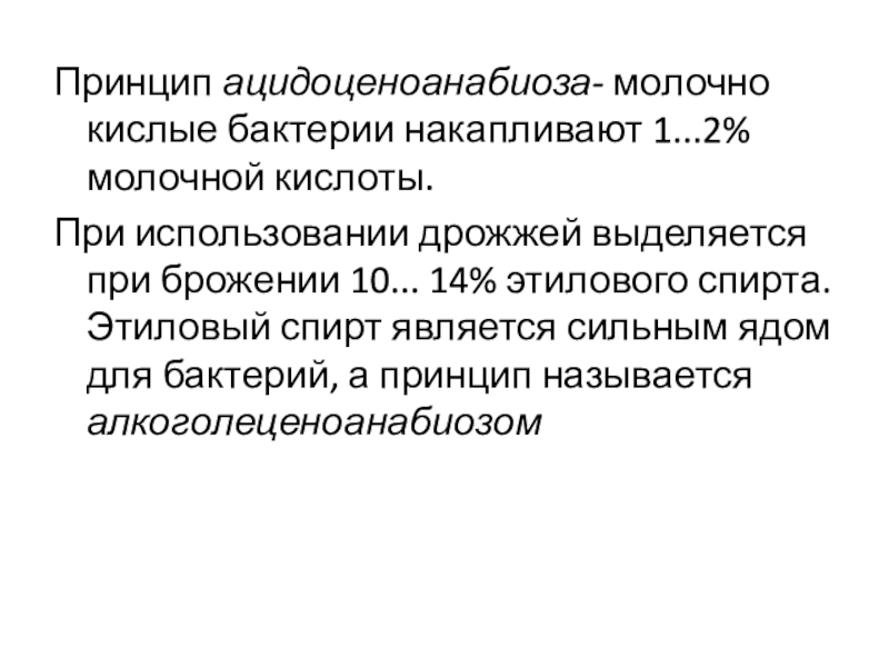 Слайд 18Принцип ацидоценоанабиоза- молочнокислые бактерии накапливают 1...2% молочной кислоты.