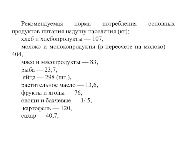 Слайд 2Рекомендуемая норма потребления основных продуктов питания надушу населения (кг):