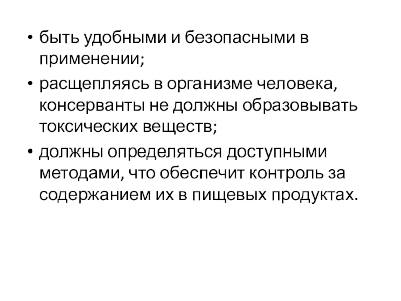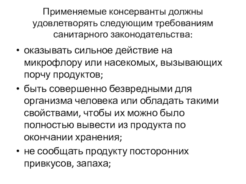 Слайд 20Применяемые консерванты должны удовлетворять следующим требованиям санитарного законодательства: