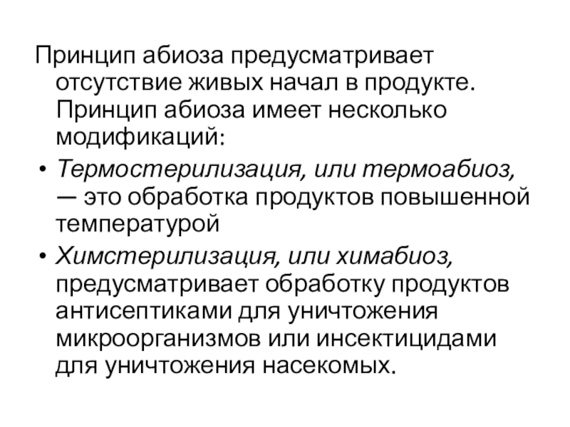 Слайд 19Принцип абиоза предусматривает отсутствие живых начал в продукте. Принцип абиоза
