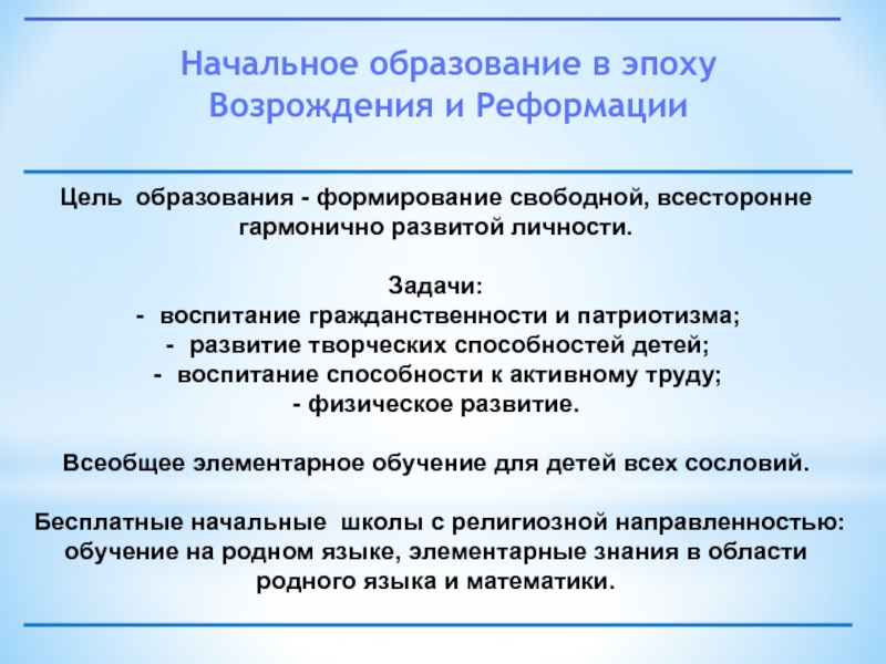 Слайд 11Начальное образование в эпоху Возрождения и Реформации