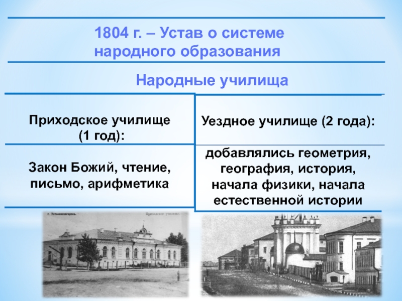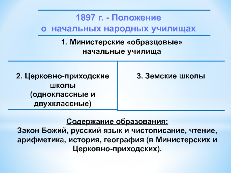 арифметика, история, география (в Министерских и Церковно-приходских).