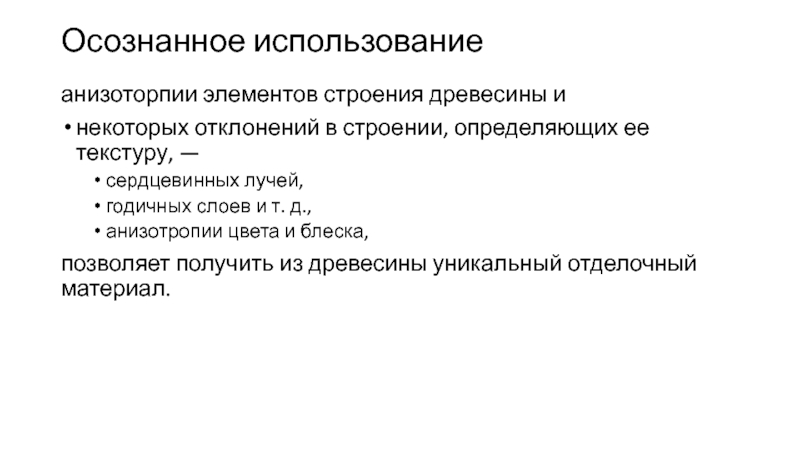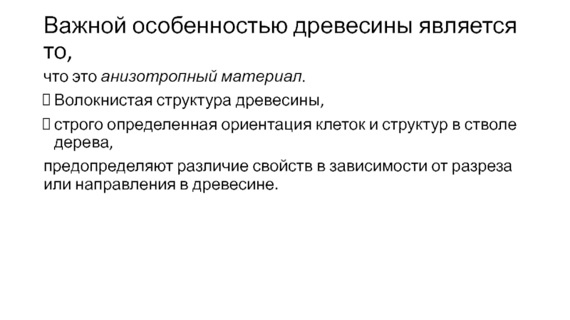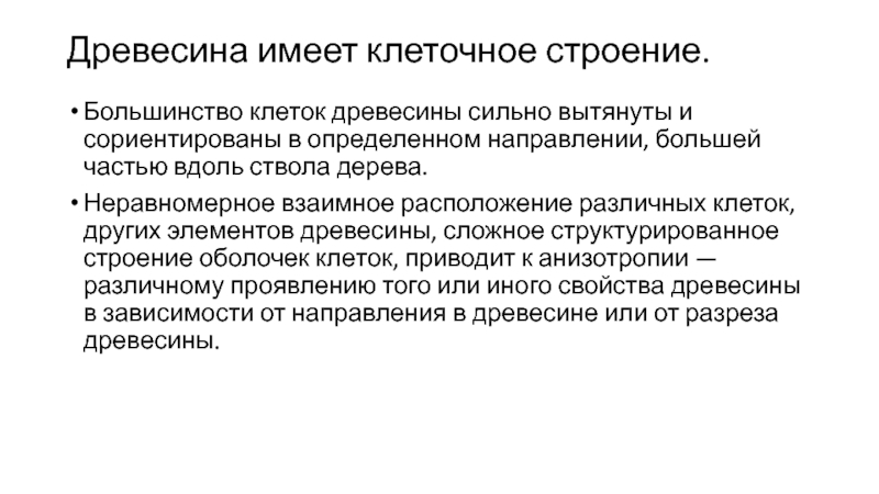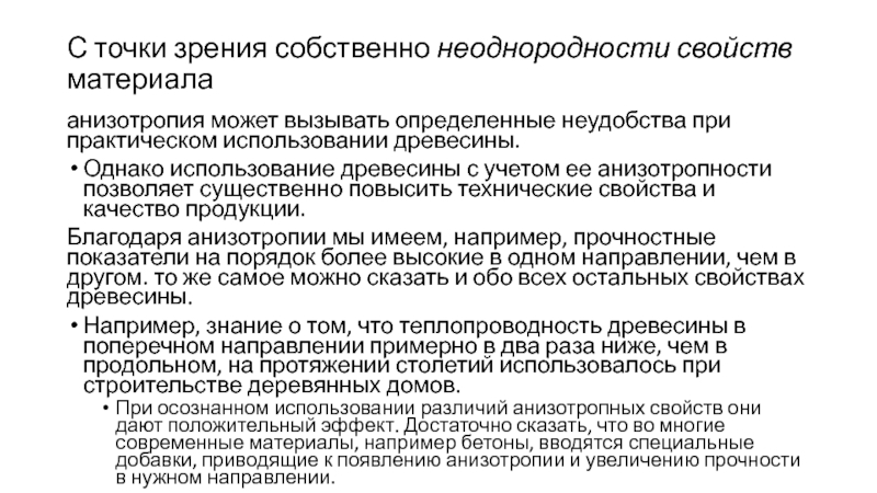 Благодаря анизотропии мы имеем, например, прочностные показатели на порядок более высокие в одном направлении, чем в другом. то же самое можно сказать и обо всех остальных свойствах древесины.