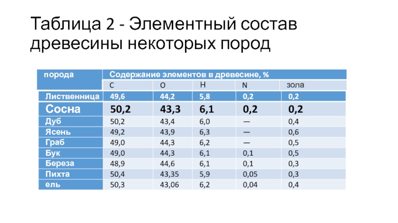 Слайд 56Таблица 2 - Элементный состав древесины некоторых пород