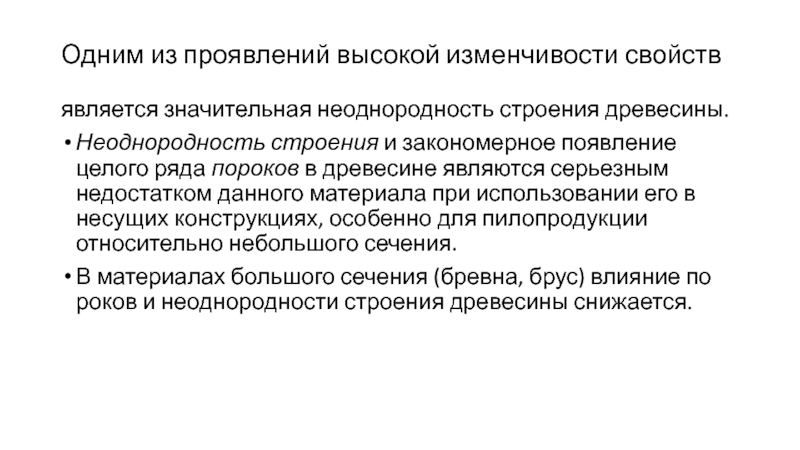 В материалах большого сечения (бревна, брус) влияние пороков и неоднородности строения древесины снижается.