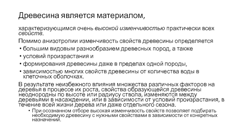 В результате неизбежного влияния множества различных факторов на деревья в процессе их роста, свойства образующейся древесины неоднородны по высоте или радиусу ствола, изменяются между деревьями в насаждении, или в зависимости от условий произрастания, в течение всей жизни дерева или даже отдельного сезона.