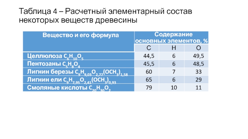 Слайд 60Таблица 4 – Расчетный элементарный состав некоторых веществ древесины