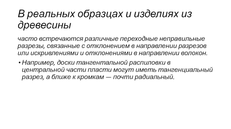 Например, доски тангентальной распиловки в центральной части пласти могут иметь тангенциальный разрез, а ближе к кромкам — почти радиальный.