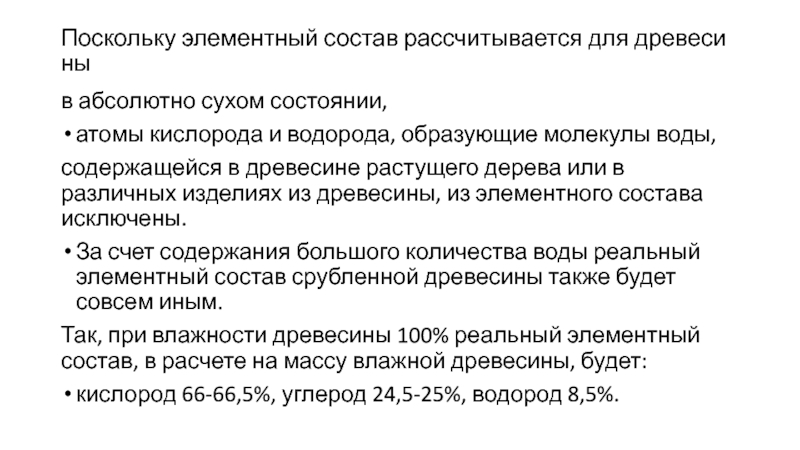 Слайд 62Поскольку элементный состав рассчитывается для древесины
