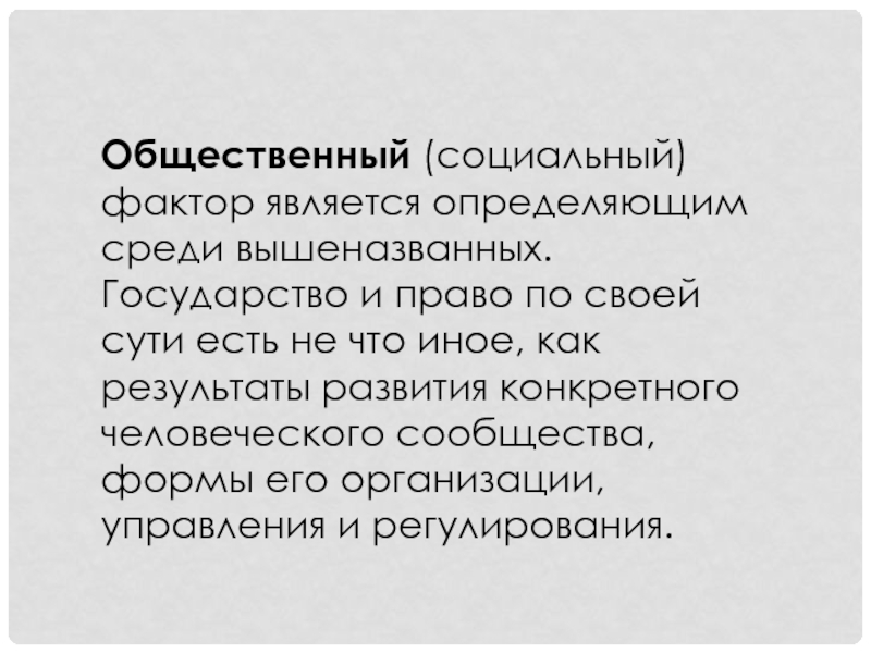 Слайд 16Общественный (социальный) фактор является определяющим среди вышеназванных. Государство и право