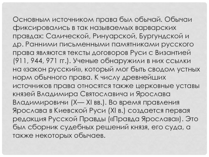 русского права являются тексты договоров Руси с Византией (911, 944, 971 гг.). Ученые обнаружили в них ссылки на «закон русский», который мог быть сводом устных норм обычного права. К числу древнейших источников права относятся также церковные уставы князей Владимира Святославича и Ярослава Владимировичи (X— XI вв.). Во время правления Ярослава в Киевской Руси (XI в.) создается первая редакция Русской Правды («Правда Ярослава»). Это был сборник судебных решений князя, его суда, а также некоторых обычаев.