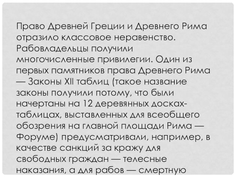 — Законы XII таблиц (такое название законы получили потому, что были начертаны на 12 деревянных досках-таблицах, выставленных для всеобщего обозрения на главной площади Рима — Форуме) предусматривали, например, в качестве санкций за кражу для свободных граждан — телесные наказания, а для рабов — смертную казнь.