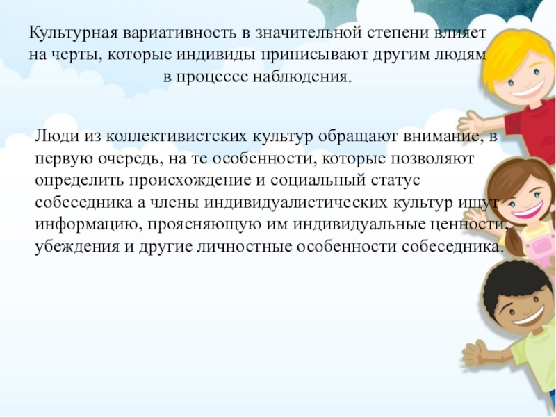 обращают внимание, в первую очередь, на те особенности, которые позволяют определить происхождение и социальный статус собеседника а члены индивидуалистических культур ищут информацию, проясняющую им индивидуальные ценности, убеждения и другие личностные особенности собеседника.