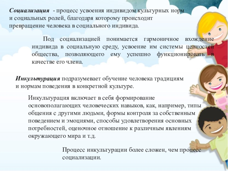 Социализация - процесс усвоения индивидом культурных норм и социальных ролей, благодаря которому происходит превращение человека в социального