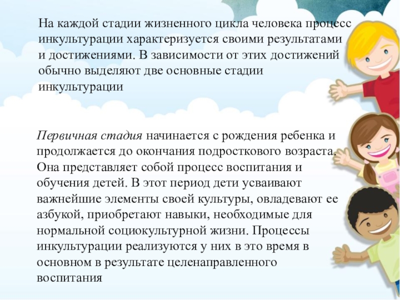 Слайд 9На каждой стадии жизненного цикла человека процесс инкультурации характеризуется своими