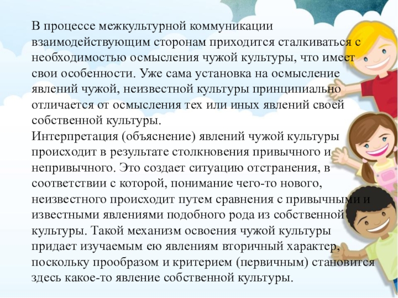 В процессе межкультурной коммуникации взаимодействующим сторонам приходится сталкиваться с необходимостью осмысления чужой культуры, что имеет свои особенности.