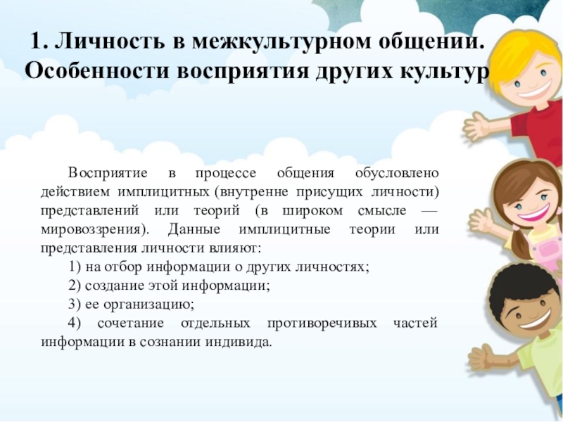 1. Личность в межкультурном общении. Особенности восприятия других культурВосприятие в процессе общения обусловлено действием имплицитных (внутренне присущих личности)