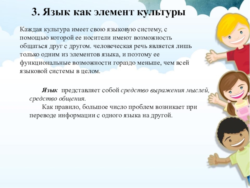 3. Язык как элемент культурыКаждая культура имеет свою языковую систему, с помощью которой ее носители имеют возможность