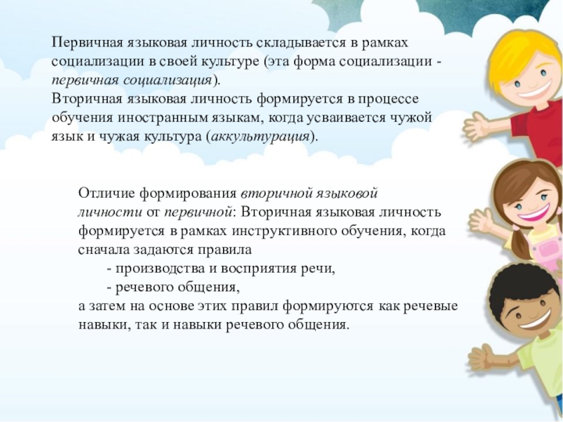 Первичная языковая личность складывается в рамках социализации в своей культуре (эта форма социализации - первичная социализация). Вторичная языковая личность формируется