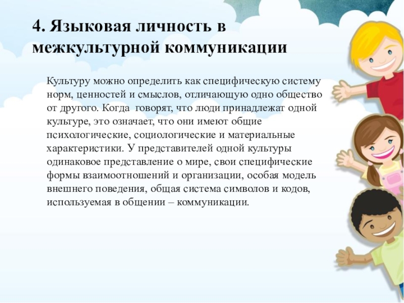 4. Языковая личность в межкультурной коммуникацииКультуру можно определить как специфическую систему норм, ценностей и смыслов, отличающую одно