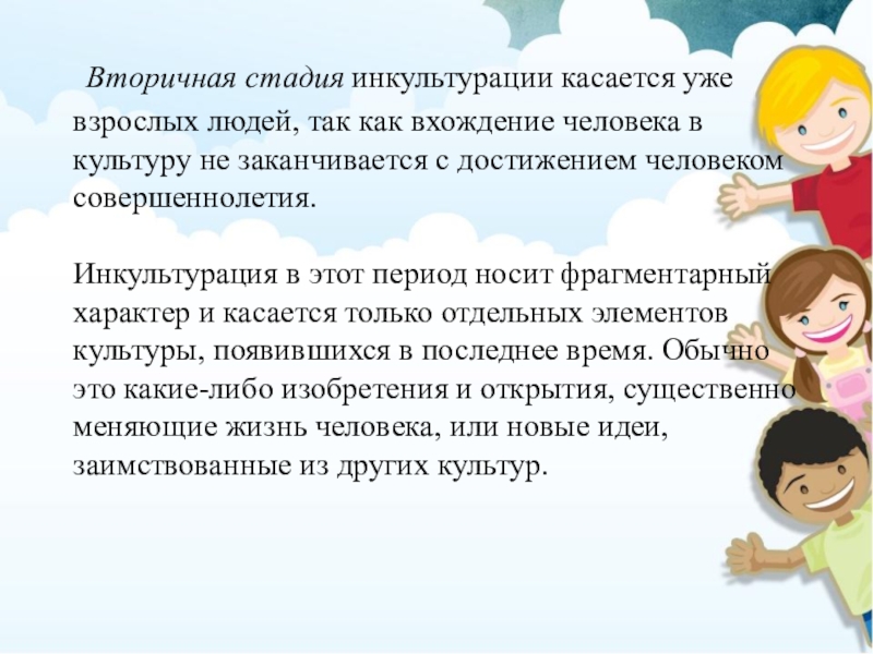Вторичная стадия инкультурации касается уже взрослых людей, так как вхождение человека в культуру не заканчивается с