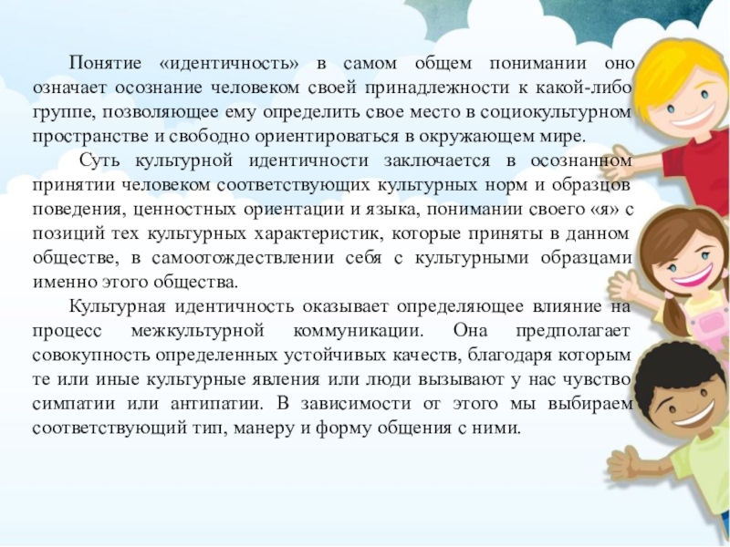 Понятие «идентичность» в самом общем понимании оно означает осознание человеком своей принадлежности к какой-либо группе, позволяющее ему