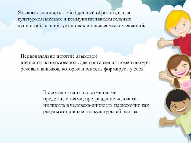Языковая личность - обобщённый образ носителя культурноязыковых и коммуникативнодеятельных ценностей, знаний, установок и поведенческих реакций. Первоначально понятие языковой