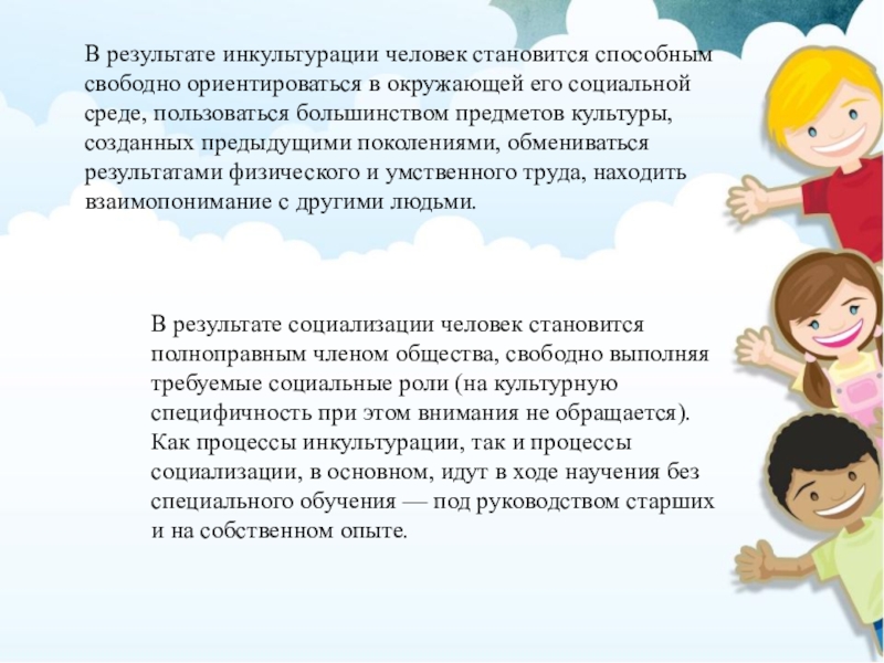 В результате инкультурации человек становится способным свободно ориентироваться в окружающей его социальной среде, пользоваться большинством предметов культуры,