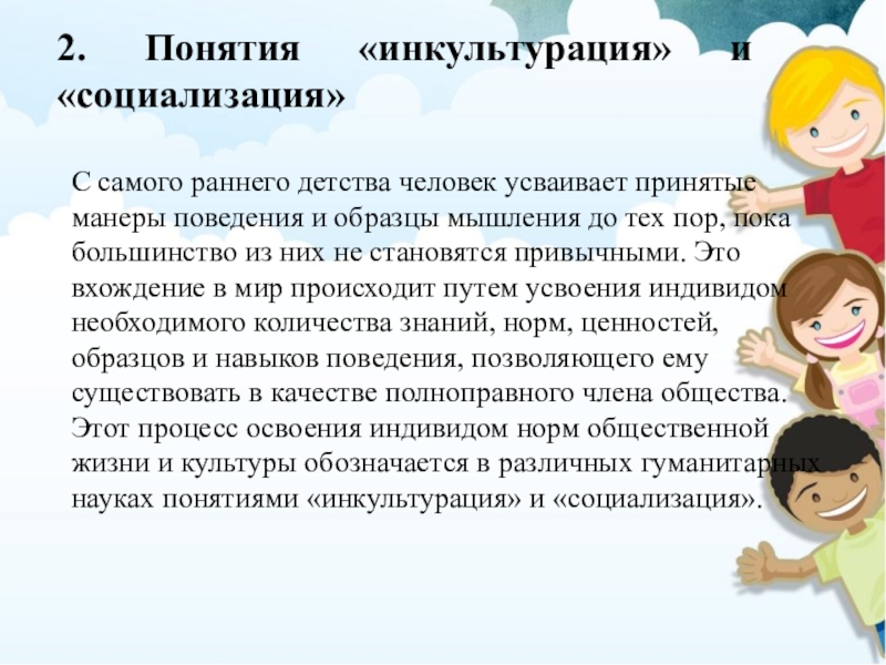 2. Понятия «инкультурация» и «социализация»С самого раннего детства человек усваивает принятые манеры поведения и образцы мышления до