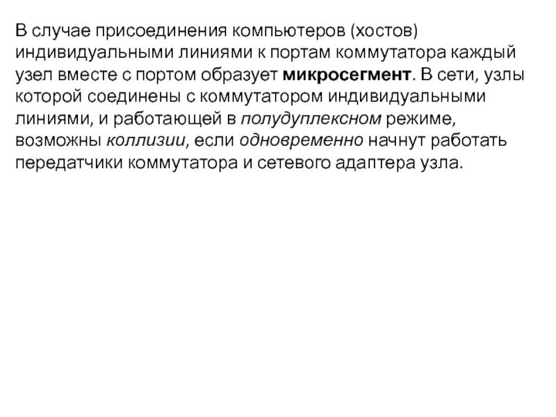 Слайд 7В случае присоединения компьютеров (хостов) индивидуальными линиями к портам коммутатора