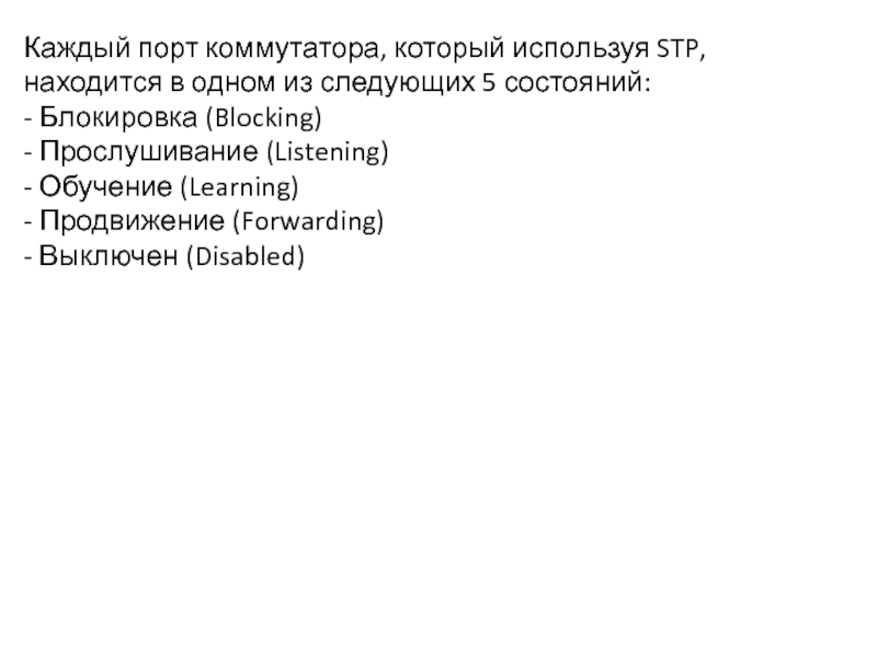 Слайд 33Каждый порт коммутатора, который используя STP, находится в одном из