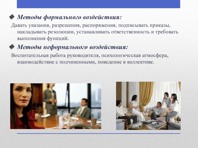 Методы данной группы реализуются в форме директивы, приказа, указания, распоряжения, резолюции, предписания и т. д.