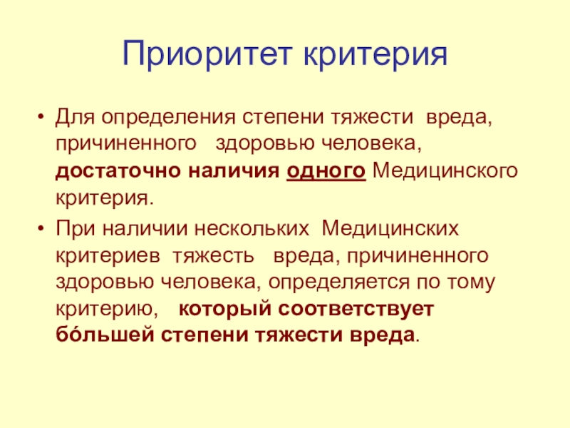 тяжесть вреда, причиненного здоровью человека, определяется по тому критерию, который соответствует бόльшей степени тяжести вреда.