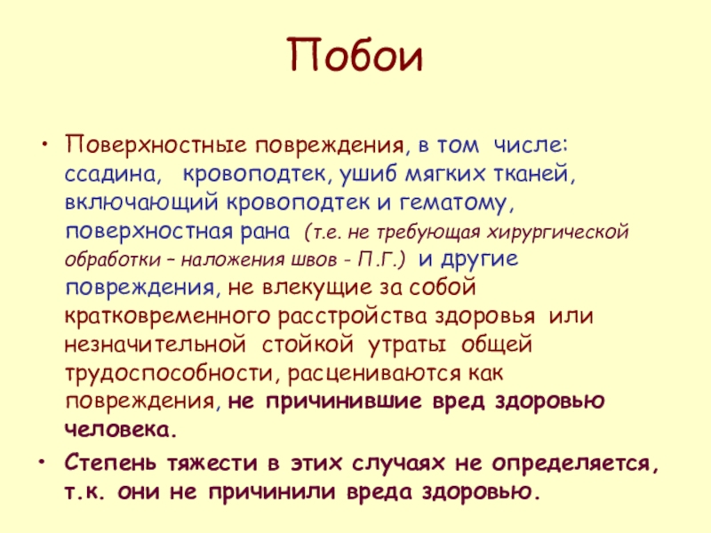 хирургической обработки – наложения швов - П.Г.) и другие повреждения, не влекущие за собой кратковременного расстройства здоровья или незначительной стойкой утраты общей трудоспособности, расцениваются как повреждения, не причинившие вред здоровью человека.