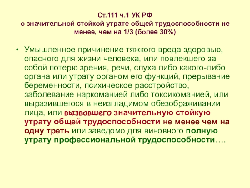 В Законе – ст.111УК РФ ч.1: «Умышленное причинение тяжкого вреда здоровью, опасного для жизни человека, или повлекшего за собой потерю зрения, речи, слуха либо какого-либо органа или утрату органом его функций, прерывание беременности, психическое расстройство, заболевание наркоманией либо токсикоманией, или выразившегося в неизгладимом обезображивании лица, или вызвавшего значительную стойкую утрату общей трудоспособности не менее чем на одну треть или заведомо для виновного полную утрату профессиональной трудоспособности».