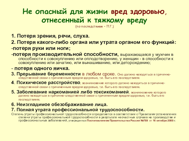 опасного для жизни человека, или повлекшего за собой потерю зрения, речи, слуха либо какого-либо органа или утрату органом его функций, прерывание беременности, психическое расстройство, заболевание наркоманией либо токсикоманией, или выразившегося в неизгладимом обезображивании лица, или вызвавшего значительную стойкую утрату общей трудоспособности не менее чем на одну треть или заведомо для виновного полную утрату профессиональной трудоспособности….