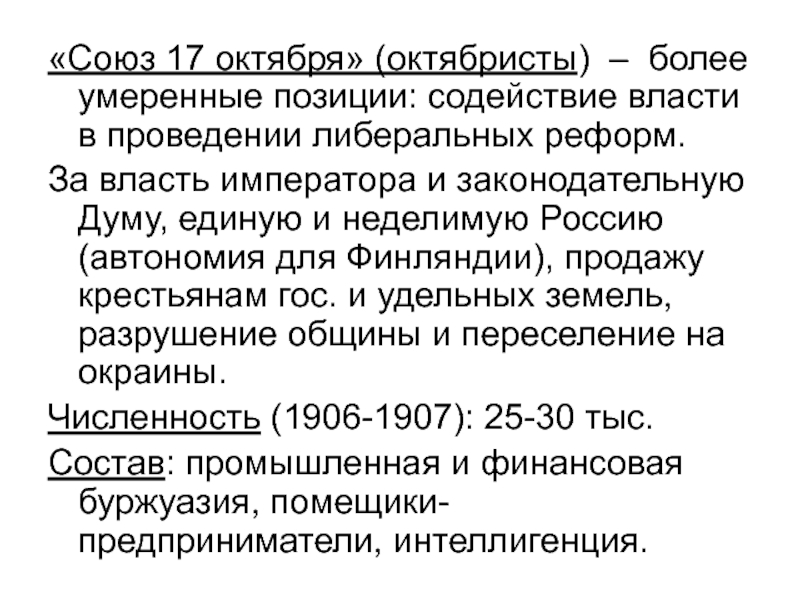 Слайд 29«Союз 17 октября» (октябристы) – более умеренные позиции: содействие власти
