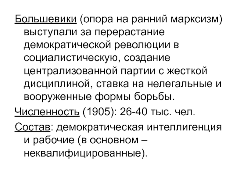 Слайд 20Большевики (опора на ранний марксизм) выступали за перерастание демократической революции