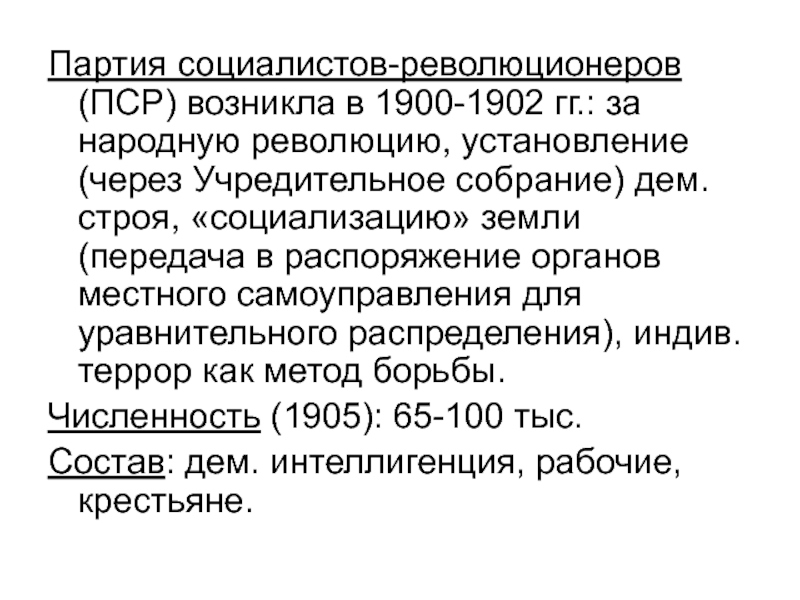 социал-демократические (марксистские) – РСДРП (большевики и меньшевики) и неонароднические – ПСР и анархисты.