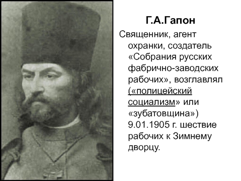 русских фабрично-заводских рабочих», возглавлял («полицейский социализм» или «зубатовщина») 9.01.1905 г.