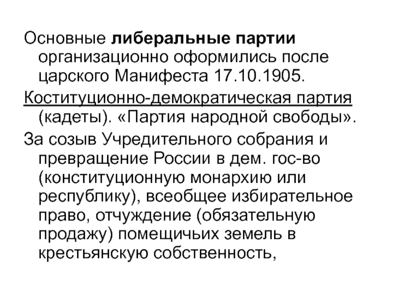 в дем. гос-во (конституционную монархию или республику), всеобщее избирательное право, отчуждение (обязательную продажу) помещичьих земель в крестьянскую собственность,
