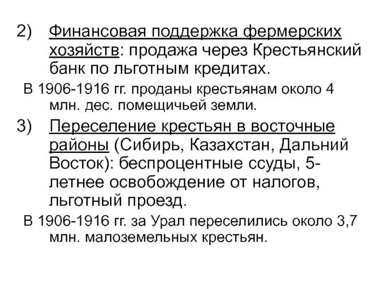 Переселение крестьян в восточные районы (Сибирь, Казахстан, Дальний Восток): беспроцентные ссуды, 5-летнее освобождение от налогов, льготный проезд.