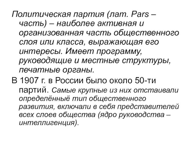 В 1907 г. в России было около 50-ти партий. Самые крупные из них отстаивали определённыё тип общественного развития, включали в себя представителей всех слоев общества (ядро руководства –интеллигенция).