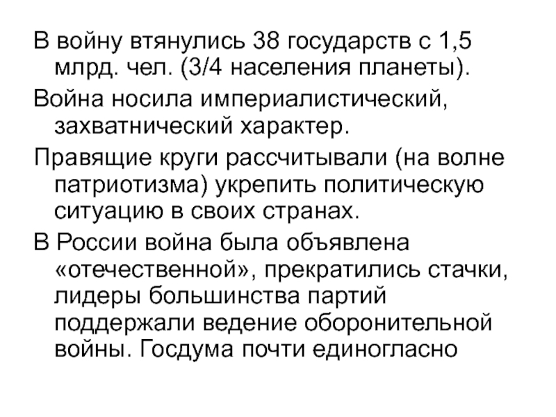 В России война была объявлена «отечественной», прекратились стачки, лидеры большинства партий поддержали ведение оборонительной войны. Госдума почти единогласно