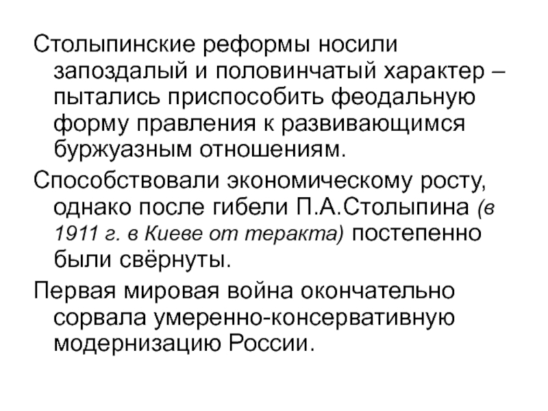 Слайд 44Столыпинские реформы носили запоздалый и половинчатый характер – пытались приспособить